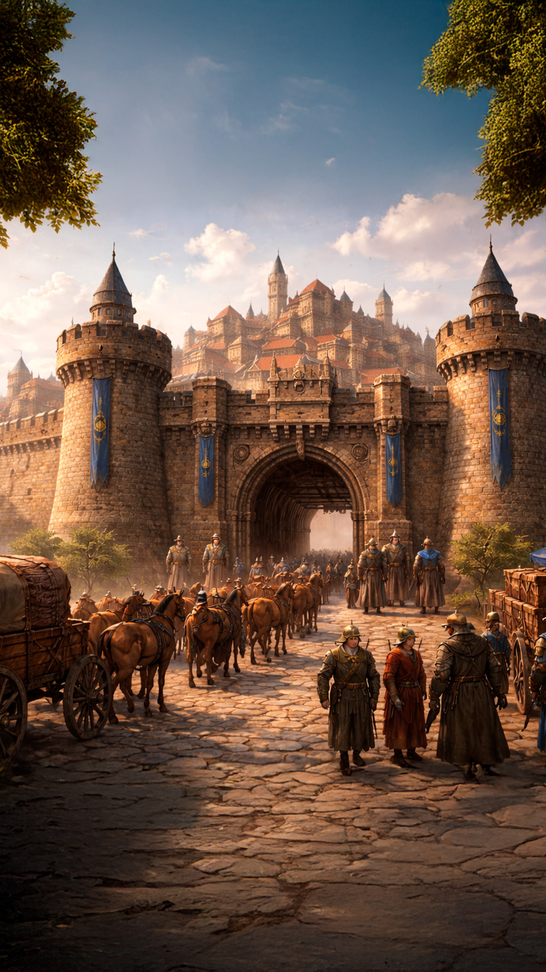 Guardas armados vigiavam a entrada, atentos, examinando cada rosto. À frente deles, uma pequena fila avançava lentamente. Fazendeiros cobertos de poeira, pessoas a pé carregando sacos e ferramentas, viajantes cansados, todos eram parados, questionados, liberados ou retidos por alguns instantes. Jarvan não se abria sem cautela.