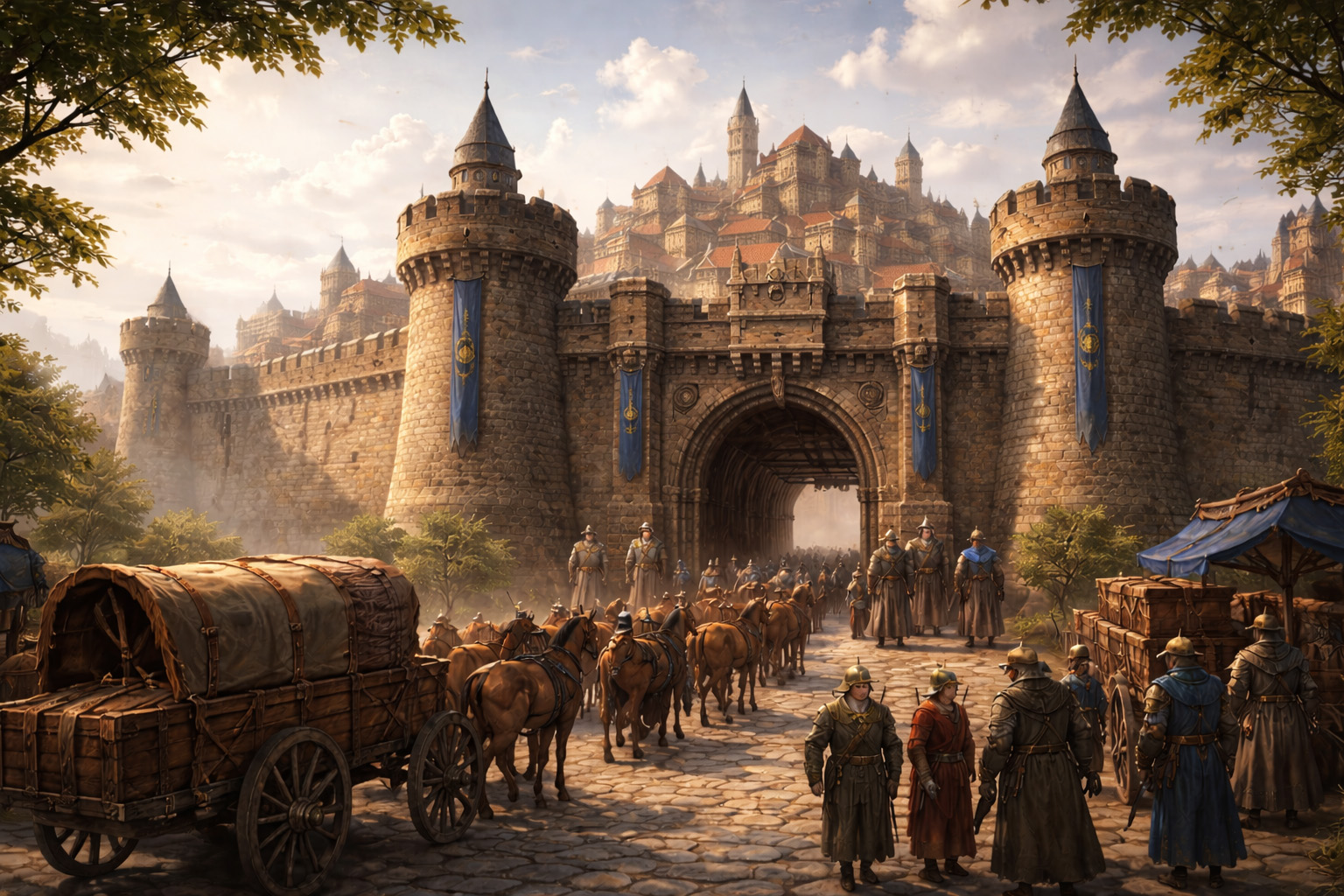 Assim que atravessaram o portão, Jarvan se abriu diante deles em toda a sua escala esmagadora. Não era apenas grande, era vastíssima. Uma cidade de pedra erguida com intenção e permanência. As muralhas internas se sucediam como camadas de defesa, delimitando bairros, distritos e praças amplas. Casas altas de alvenaria sólida se alinhavam ao longo de ruas largas, pavimentadas com blocos de pedra cuidadosamente assentados, polidos pelo fluxo constante de pessoas e carroças. Arcos ligavam construções, pontes menores cruzavam desníveis, e torres se erguiam em pontos estratégicos, vigiando não inimigos externos, mas o próprio coração da cidade. O som era constante. Martelos batendo, rodas rangendo, vozes se cruzando em dezenas de idiomas e sotaques. Jarvan respirava movimento.